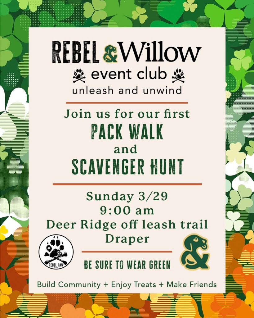 Dog owners are invited to kick off the morning with a relaxed Pack Walk and Scavenger Hunt hosted by Rebel and Willow Event Club. The community meetup takes place Sunday, March 29 at 9:00 AM on the Deer Ridge Off-Leash Trail in Draper. Participants can enjoy a casual group walk with their dogs while completing a fun scavenger hunt along the trail. Rebel Paw will provide treats, and Willow & Co. will have a photo booth set up so pups and their humans can capture the moment. Guests are encouraged to wear green and come ready to build community, enjoy treats, and make new friends along the way. 🐾🍀
