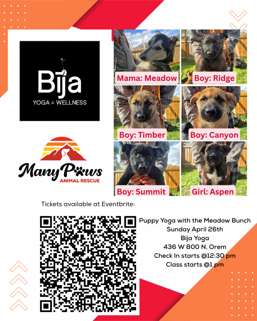 Puppy lovers are invited to unwind and stretch at Mama Meadow’s Puppy Yoga, a feel-good class combining gentle yoga with playful puppy interaction. Hosted by ManyPaws Animal Rescue, this unique event takes place Sunday, April 26, 2026 at Bija Yoga and Wellness in Orem.